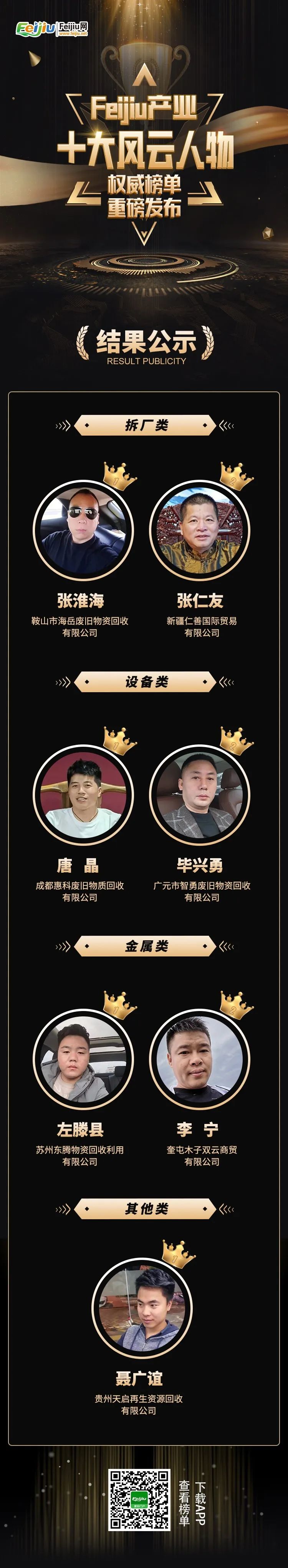 Feijiu网开展废旧产业年度风云人物评选活动,意在寻找废旧产业榜样人物,树立优秀企业家典型,致敬新时代最强驱动。践行循环经济,致敬绿色时代,推动“碳达峰、碳中和”生态文明发展目标的建设,提高废旧物资、再生资源的循环利用效率。经近两个月的报名、全网投票、验票,现将Feijiu网“2021年度Feijiu产业十大风云人物”评选结果公示如下: